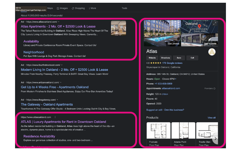 First impressions are good, they dominate the first page of Google for their brand keyword ‘Atlas Oakland’ using various methods. The first being Google Ads (shown on the listing), then at the top of the organic search you’ll see their listing, along with various site-links underneath which allows for easier navigation.