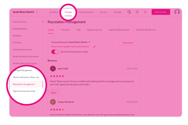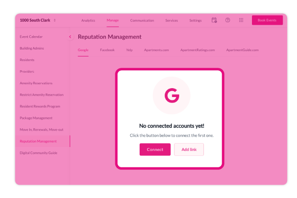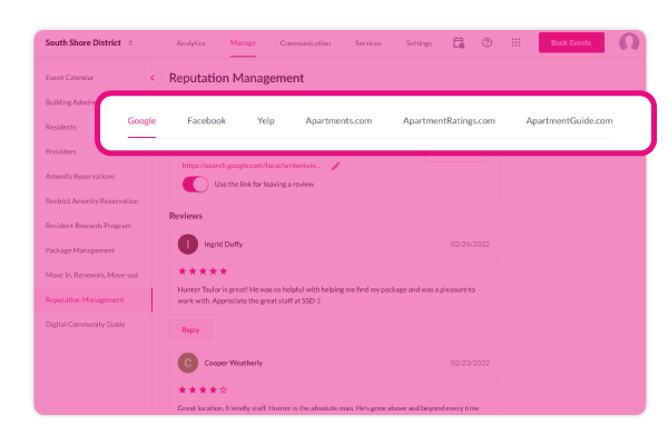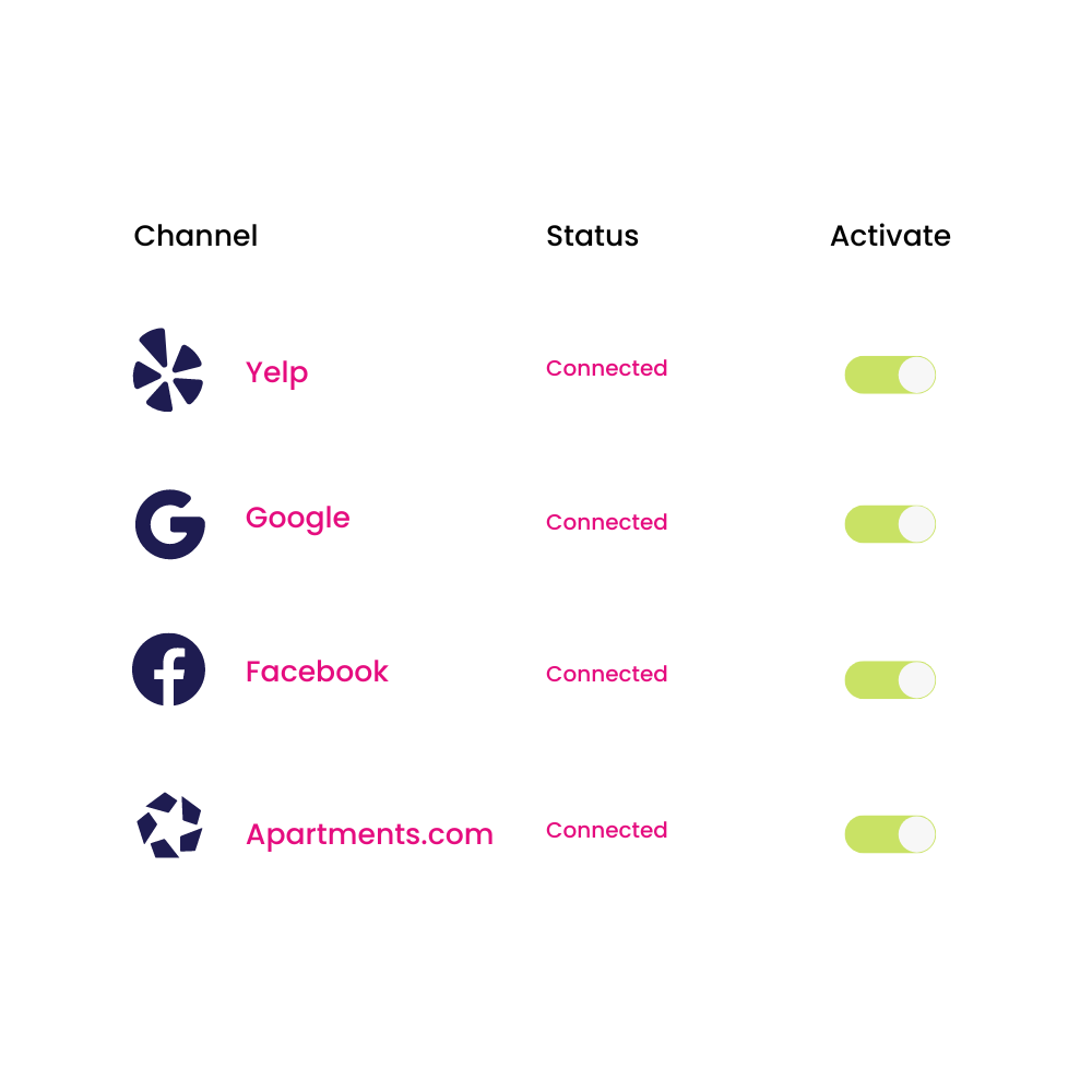 This is where you can add your review sources such as Google MyBusiness, Facebook, Yelp, Apartments.com, ApartmentRatings.com, and ApartmentGuide.com with just a simple click (or two).