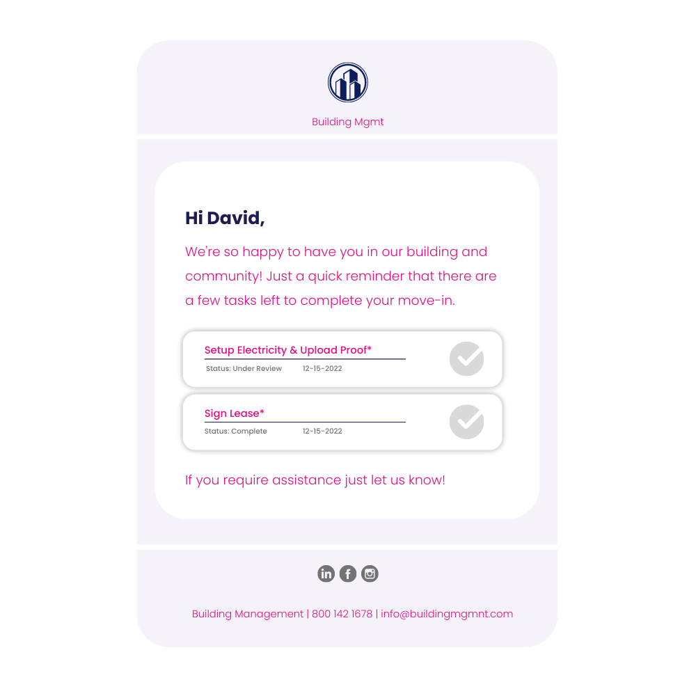 Every task residents complete means one less call to your site teams and brings residents closer to being fully onboarded and becoming a part of your community.